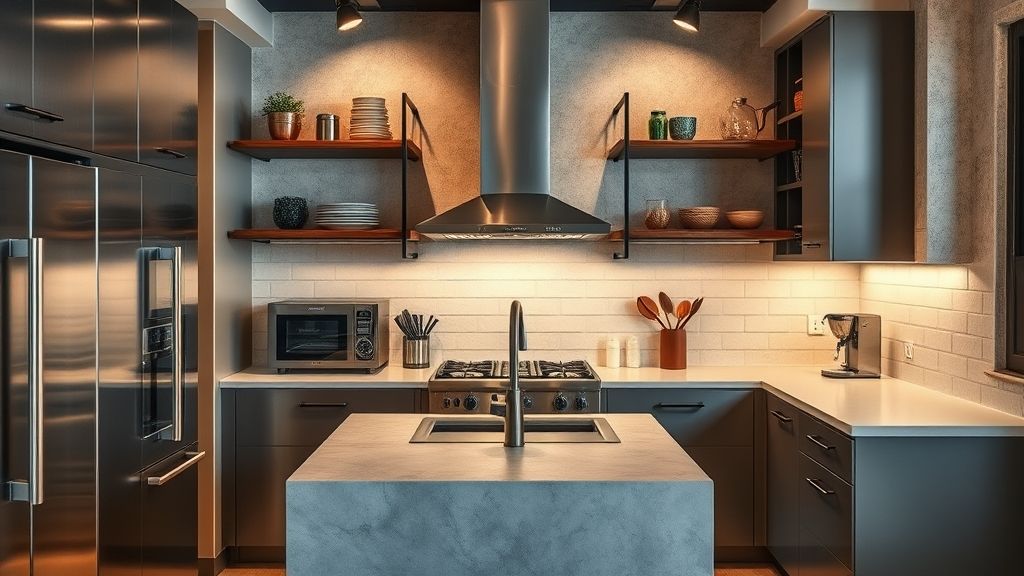 Para suavizar a estética mais dura do estilo industrial, adicione detalhes sofisticados que tragam uma sensação de luxo e modernidade. Eletrodomésticos de última geração, com acabamentos de aço inoxidável ou vidro, são perfeitos para criar um contraste refinado. O uso de peças de design, como uma cafeteira moderna ou uma coqueteleira de cobre, também pode trazer elegância ao ambiente. Além disso, introduza elementos como luminárias pendentes de design clean e contemporâneo para reforçar a sofisticação sem perder a essência do estilo industrial.