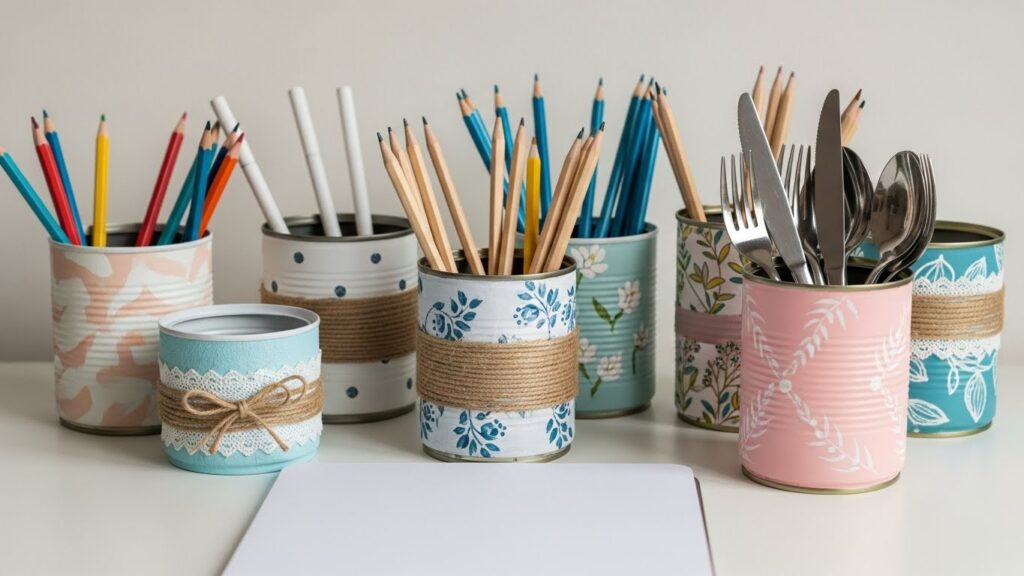 Latas podem ser transformadas em porta-lápis, porta-talheres ou organizadores para o escritório. Basta pintar e decorar conforme o estilo desejado.