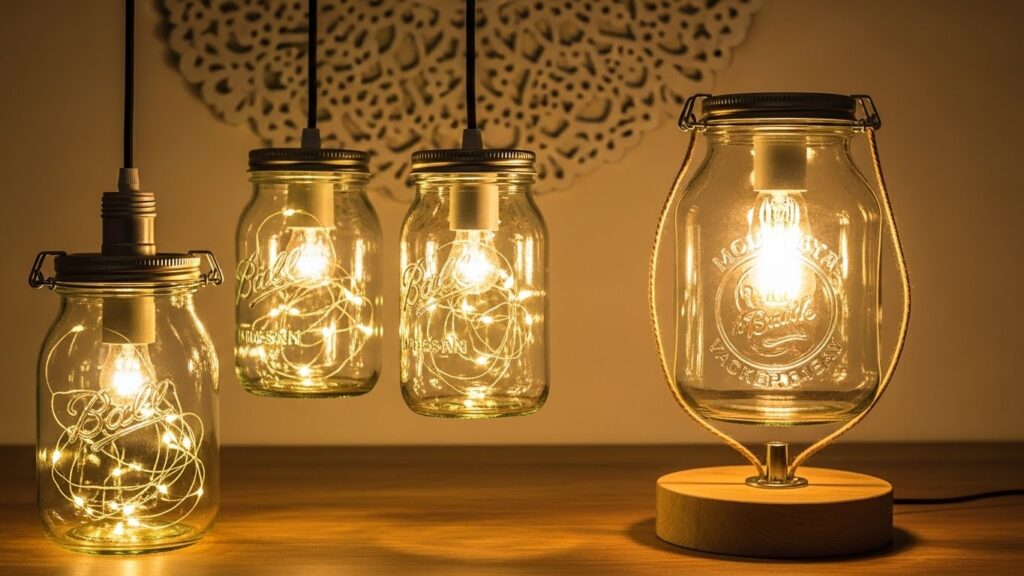 Potes de conserva podem se transformar em luminárias encantadoras, seja pendentes ou de mesa. Basta adicionar cordões de luz ou instalar um soquete com lâmpada. O vidro transparente permite que a iluminação fique suave e aconchegante, ideal para quartos, varandas e salas.