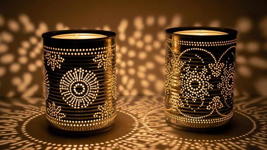 Latas perfuradas com padrões decorativos criam luminárias únicas. Quando iluminadas por dentro, projetam desenhos nas paredes, criando um clima acolhedor.