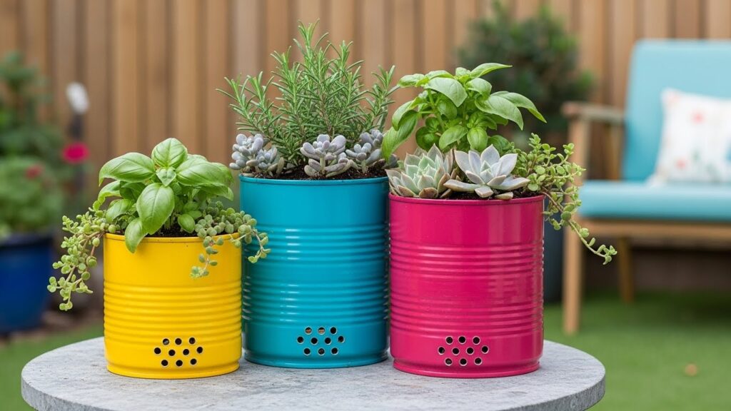 Latas maiores podem virar floreiras charmosas. O ideal é fazer pequenos furos no fundo para drenagem, pintar com cores vivas e plantar suculentas ou temperos.