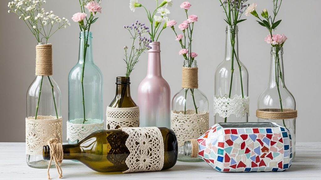 Garrafas longas podem se tornar vasos modernos para arranjos florais. Você pode pintar o interior com tinta spray, aplicar corda ao redor ou criar mosaicos para um acabamento artístico. Também é possível cortar o gargalo e produzir vasos baixos e elegantes.