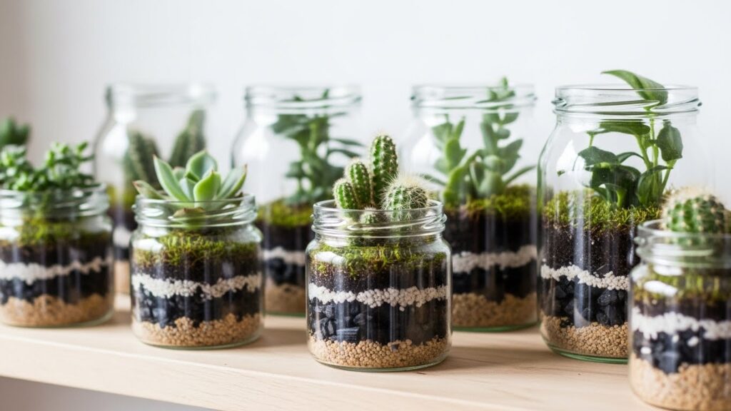 Frascos menores são perfeitos para mini terrários com suculentas, musgos ou pequenas plantas que exigem pouca manutenção. Eles podem ser usados em mesas, estantes e até no banheiro, trazendo um toque natural para qualquer espaço.