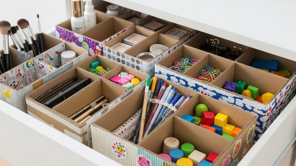 Caixas podem virar organizadores para gavetas, maquiagem, materiais de escritório ou brinquedos.