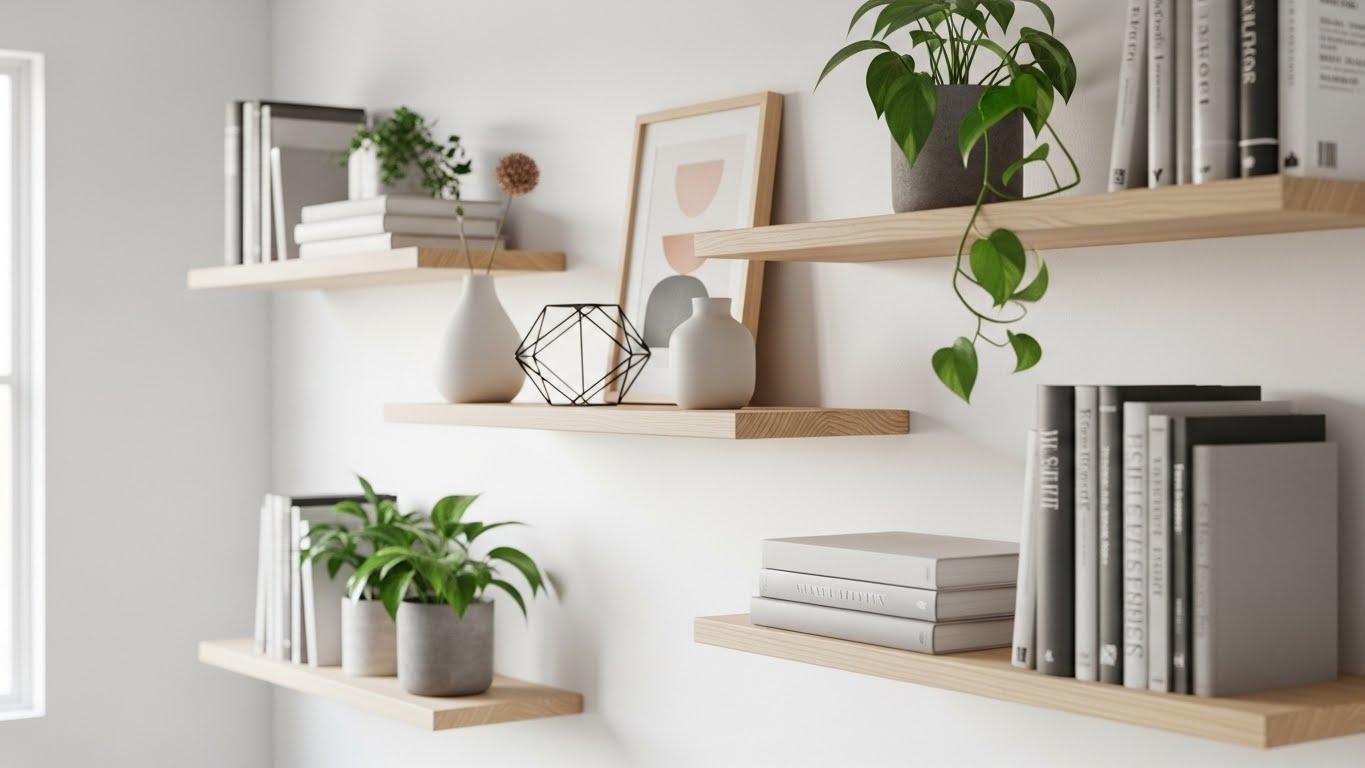 Prateleiras ajudam na organização e ainda decoram. Você pode usar madeira simples, caixotes reaproveitados ou mãos francesas acessíveis. Elas funcionam bem em salas, cozinhas, banheiros e quartos, servindo tanto para objetos decorativos quanto para itens do dia a dia.