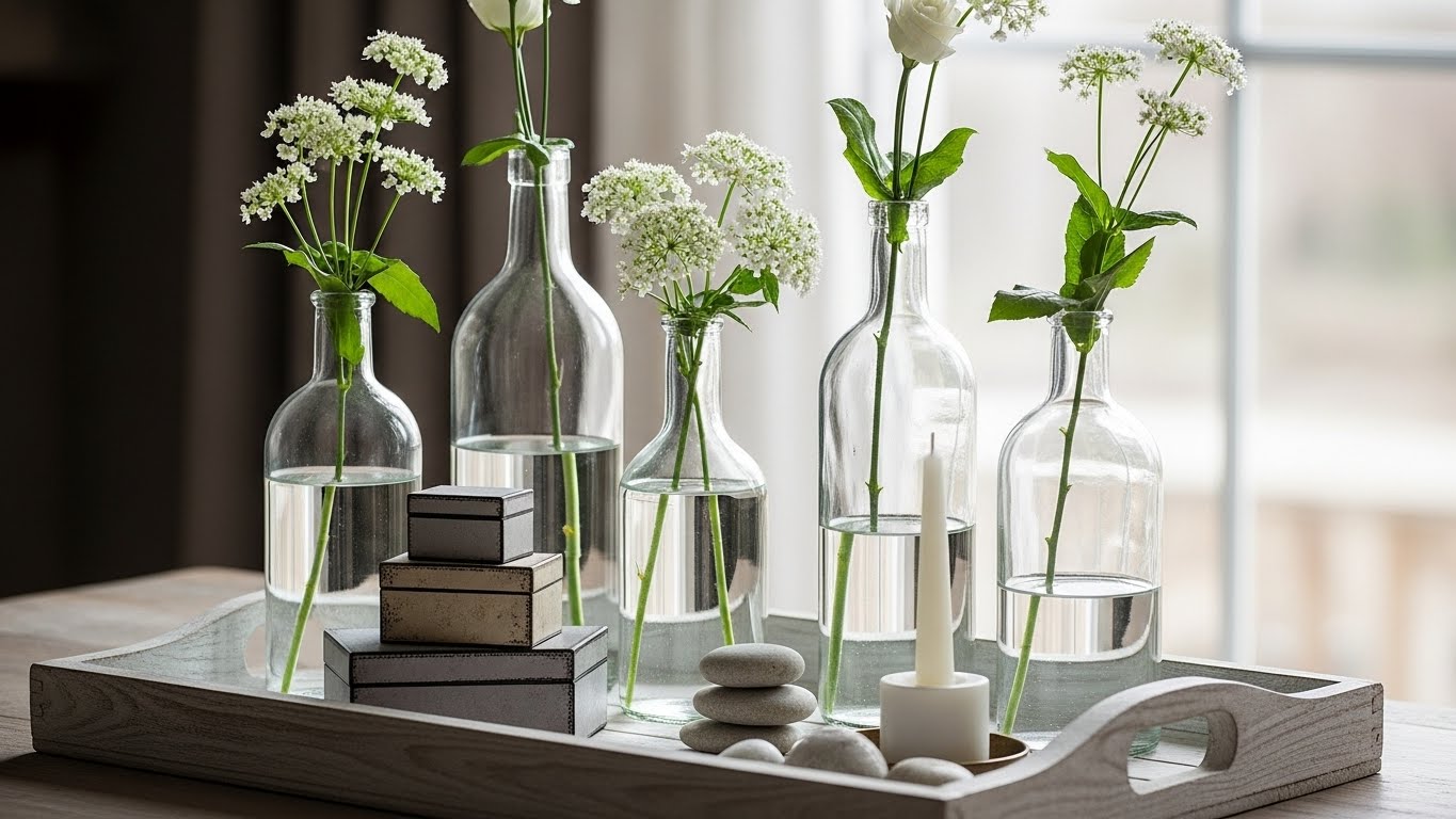 Objetos comuns ganham nova vida quando usados de forma inesperada. Garrafas viram vasos, bandejas organizam perfumes e velas, caixas se transformam em organizadores decorativos e potes de vidro podem virar luminárias ou recipientes elegantes. O reaproveitamento não só economiza, como traz identidade e originalidade para o ambiente.